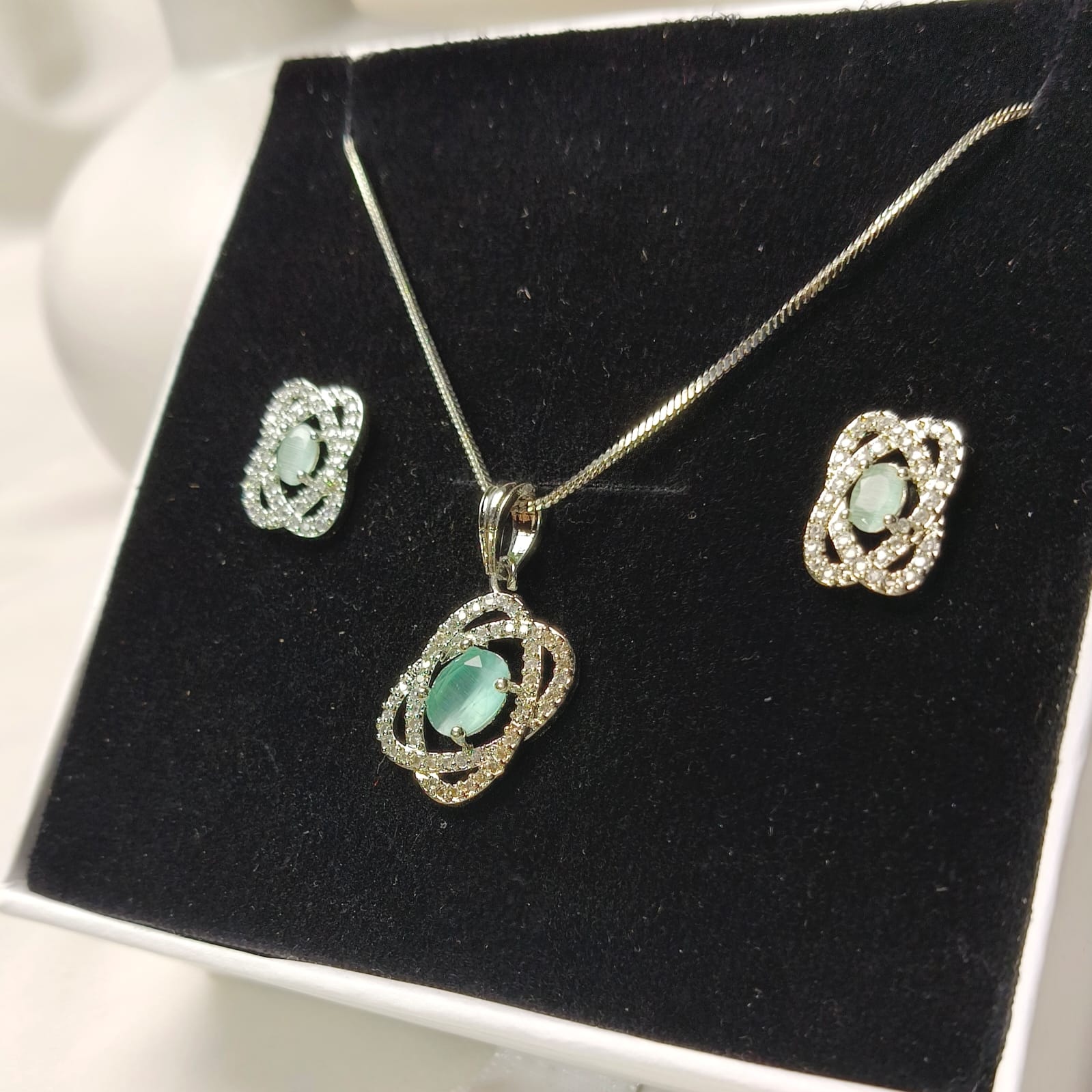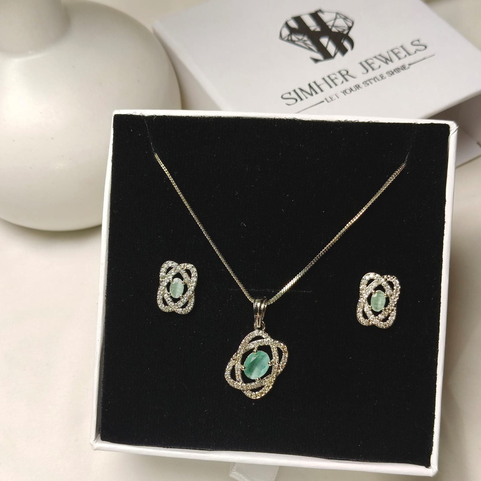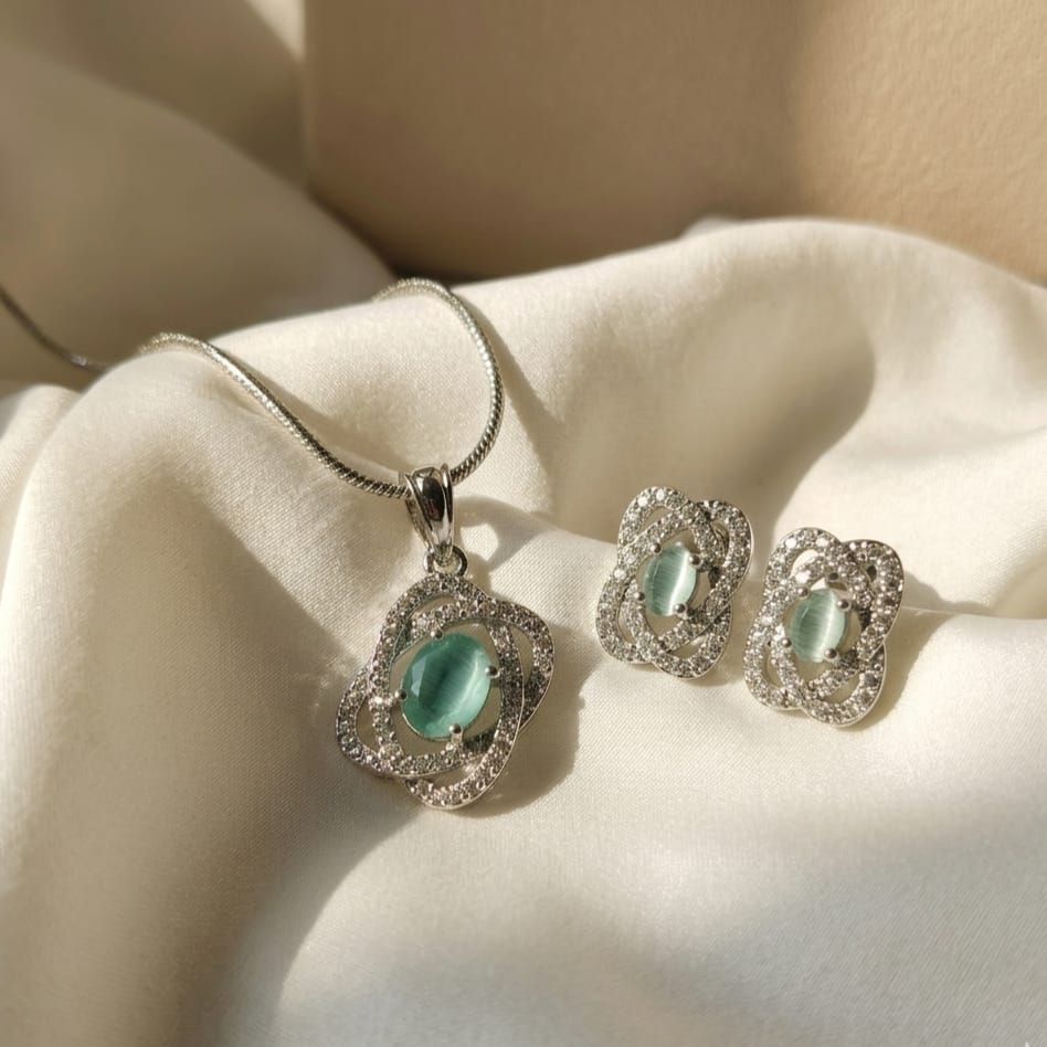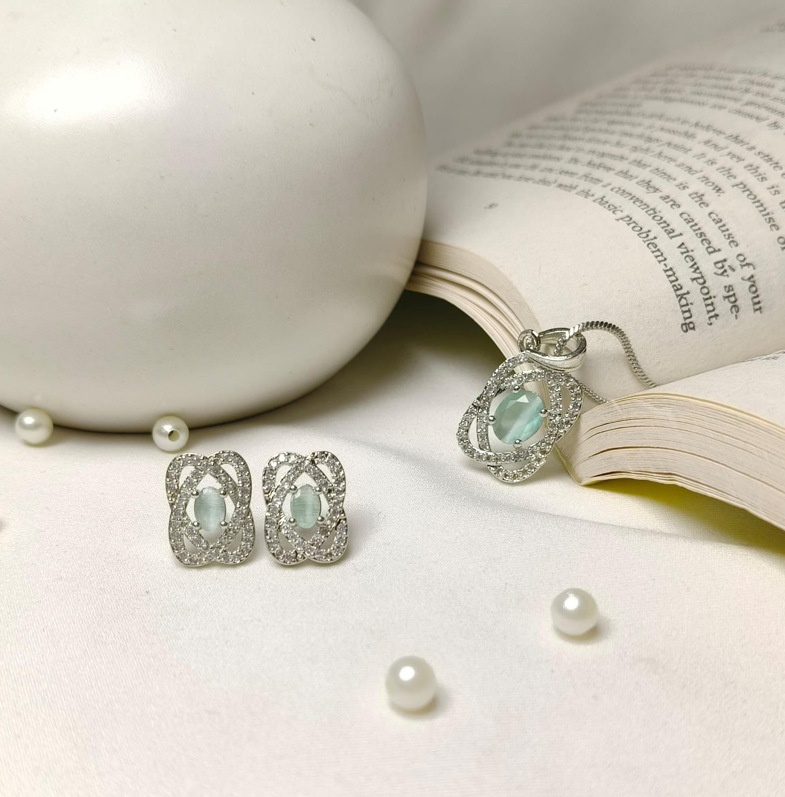 Enhance your style with this Elegant Mint Green Crystal Swirl Halo Jewelry Set, designed to bring a modern yet timeless charm to your look. The set features a captivating mint green crystal centerpiece surrounded by a unique swirl halo design, paired with a sleek pendant necklace and matching stud earrings.